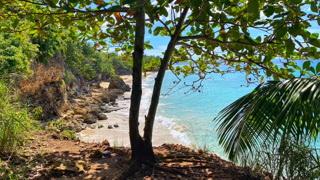 From the parking lot, the ocean looked amazing, a gorgeous turquoise blue. But as we got closer we were dismayed to see the beach covered with seaweed and quite a bit in the water as well. Swimming in seaweed is not fun. We found a shady spot and enjoyed our breakfast – cafe con leches and flan. (Eggs and milk in a different format.) Despite the seaweed, the view was amazing.